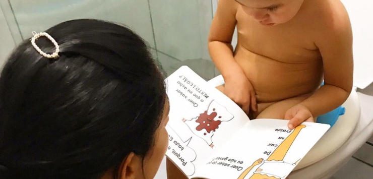 Foi 1 ano de tentativas: penico, redutor de assento, fraldas, longos dias sentados à frente do vaso sanitário à espera de que ele fizesse cocô sem choro, lágrimas e gritos! Nunca me imaginei no chão, cantando “Cocô, cocô, cocô, você é meu amigo”, enquanto meu coração se espremia para que a contração viesse e ele se permitisse livrar do tormento. Visualizou a cena, não é?