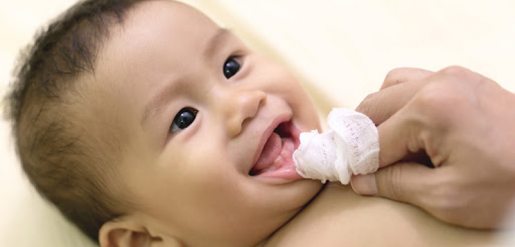 A melhor técnica é enrolar gaze úmida no dedo indicador e limpar as gengivas do bebê com delicadeza.